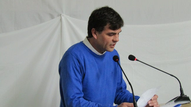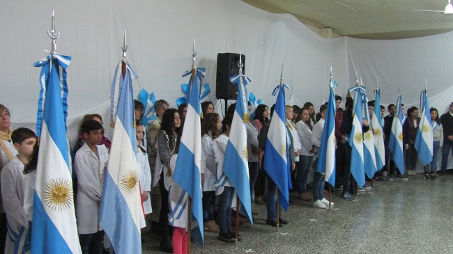 El acto dio inicio con el ingreso de las banderas de ceremonia de cada una de las instituciones educativas de la localidad, luego de la entonación del himno nacional el concejal del PJ Julio Fernández se pronunció ante los presentes.