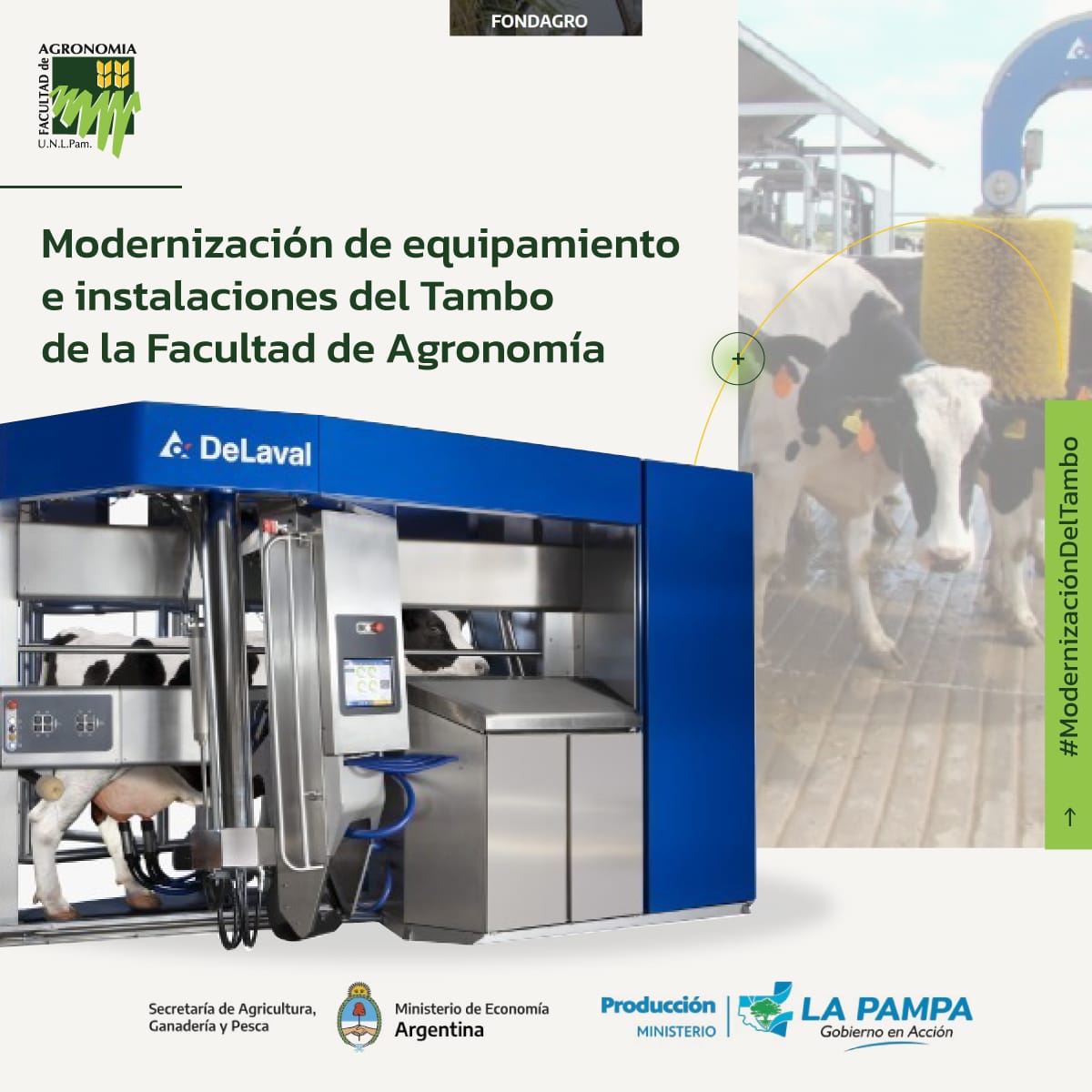 A través de un trabajo articulado entre el Gobierno nacional, el Ministerio de la Producción y la Facultad de Agronomía de la UNLPam, la unidad académica recibió un aporte de 40 millones de pesos del Fondo Cooperativo para el Desarrollo Agroempresarial (FONDAGRO) con destino a la modernización del Tambo Escuela de la Facultad.