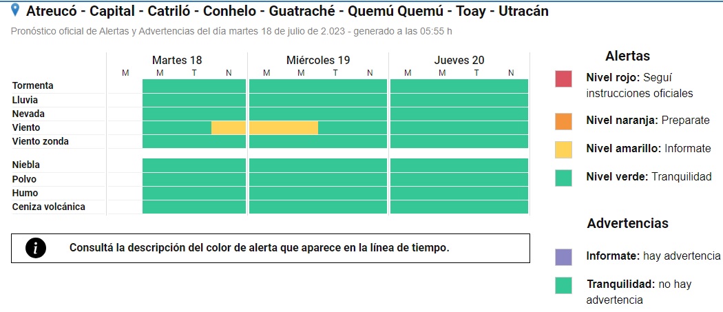 Esta previsto que para esta noche haya fuertes vientos que perdurarán hasta la tarde del miércoles con una velocidad entre los 30 y 45 kilómetros por hora pero pudiendo llegar los 90 km/h. Los departamentos incluídos son Capital, Atreucó, Catriló, Guatraché, Quemu Quemú, Toay y Utracán