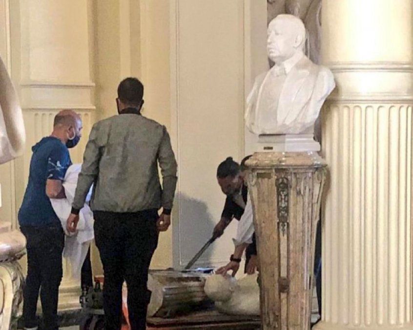 En medio de los desmanes en Casa Rosada, cuando personas irrumpieron a la fuerza para participar del funeral de Diego Armando Maradona, se produjo hoy la rotura del busto de Hipólito Yrigoyen.