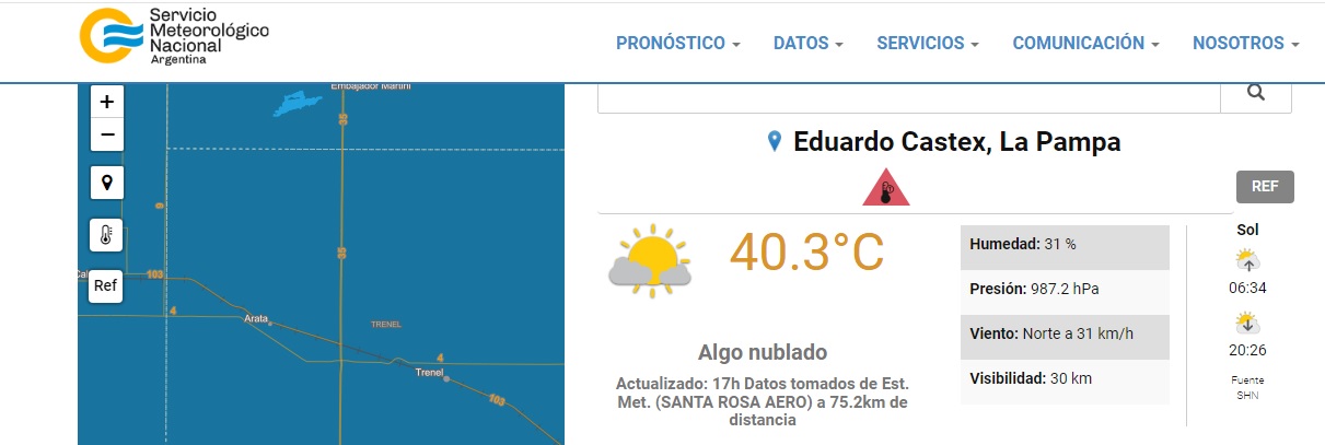 Eduardo Castex se encuentra entre las localidades más calurosas del país según indica el Servicio Meterológico Nacional con una temperatura de 40,3°C. El ranking de temperaturas emitido por el organismo nacional ubica a La Rioja con 41,2°C, San Juan 41°C, Santiago del Estero 40,8°C, Santa Rosa 40,3°C, Chamaical (La Rioja) 40,2°C, Las Lomitas (Formosa) 39,8°C, Termas de Río Hondo (Santiago del Estero) 39,4°C y llamativamente el lugar más frío a las 17 horas es La Quiaca (Jujuy) con 17,4°C seguido por Ushuaia con 17,6°C