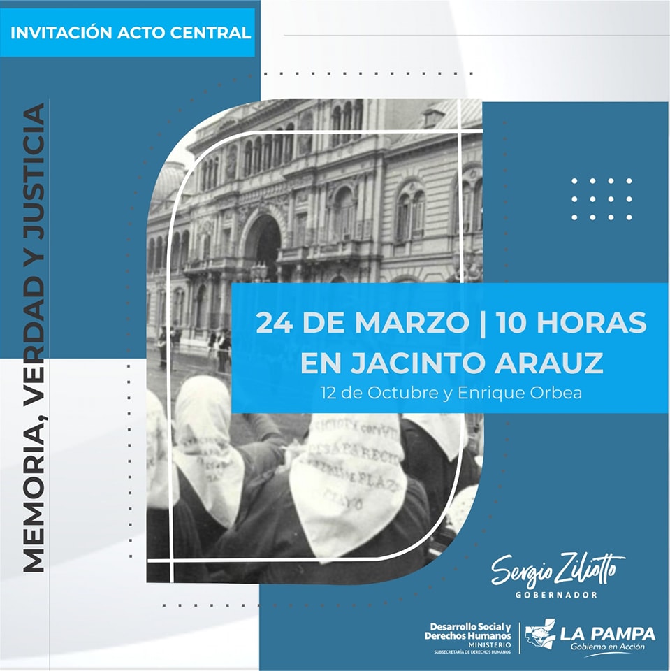 Domingo 24 de marzo: a las 10, acto central en Jacinto Arauz. Desde las 20, participación en las actividades por la Semana de la Memoria en General Pico.