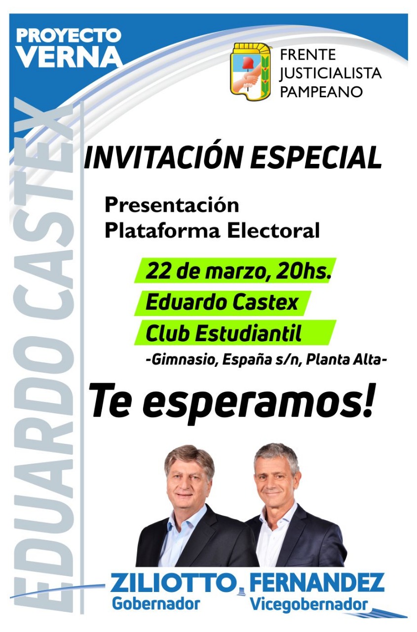El próximo viernes 22 a las 20 horas en la planta alta del gimnasio Teodoro Peralbo del club Estudiantil la fórmula del FreJuPa encabezada por Sergio Ziliotto candidato a gobernador estará en Eduardo Castex para presentar la plataforma electoral