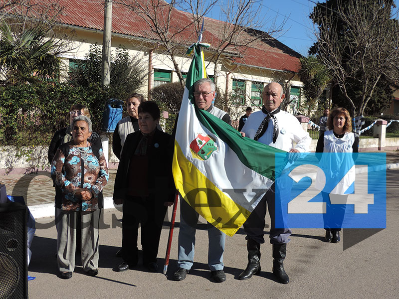 Para dar inicio al acto que estuvo encabezado por el intendente Ángel Ré, ingresaron las banderas de ceremonia de la Escuela Hogar N°79 y la bandera de la localidad portada por los pobladores más antiguos.
