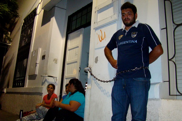 Angel Marana estuvo encadenado unas 15 horas en la puerta de ingreso a la sede del Ministerio de Salud de La Pampa, en protesta porque su hija de 7 meses, que está internada en el Hospital Lucio Molas, no era trasladada a un centro médico de complejidad de Buenos Aires.