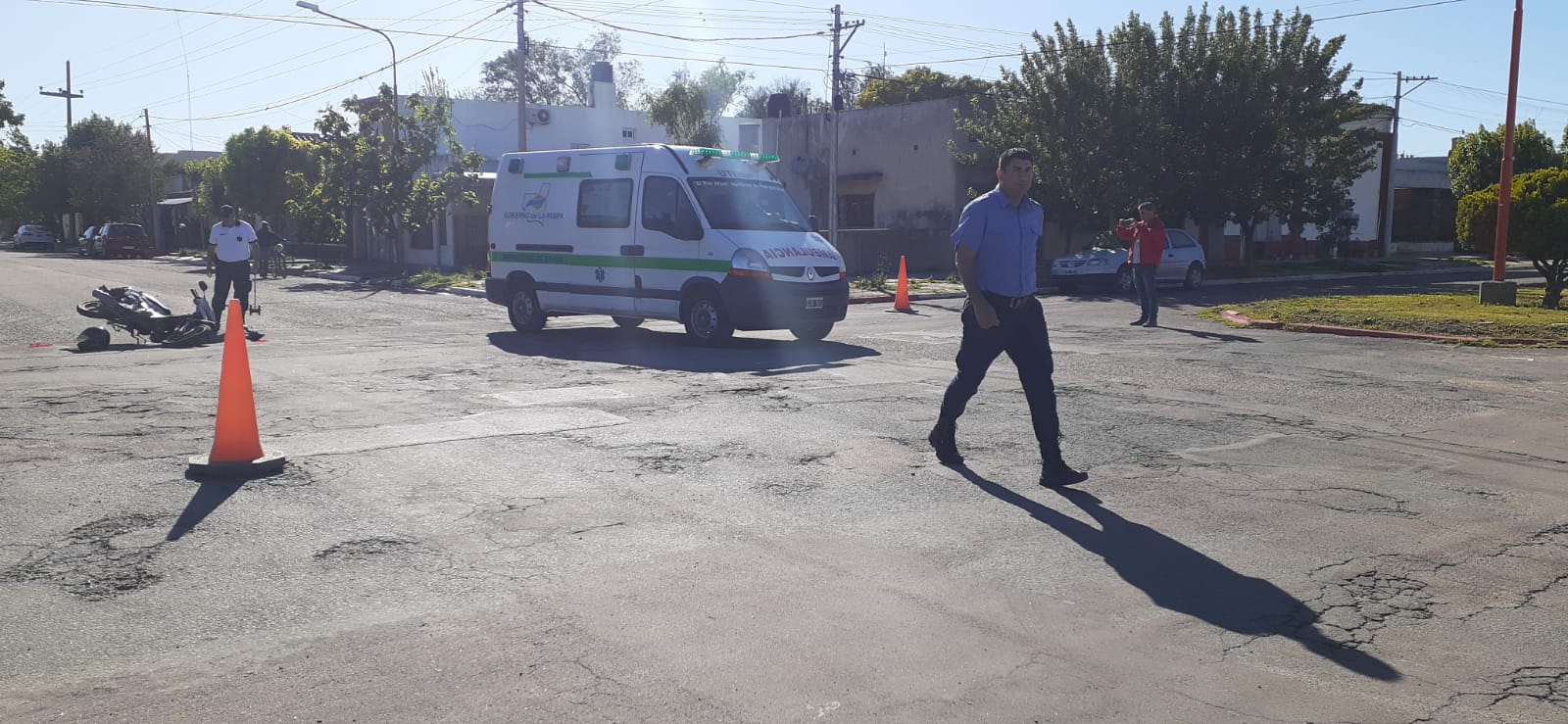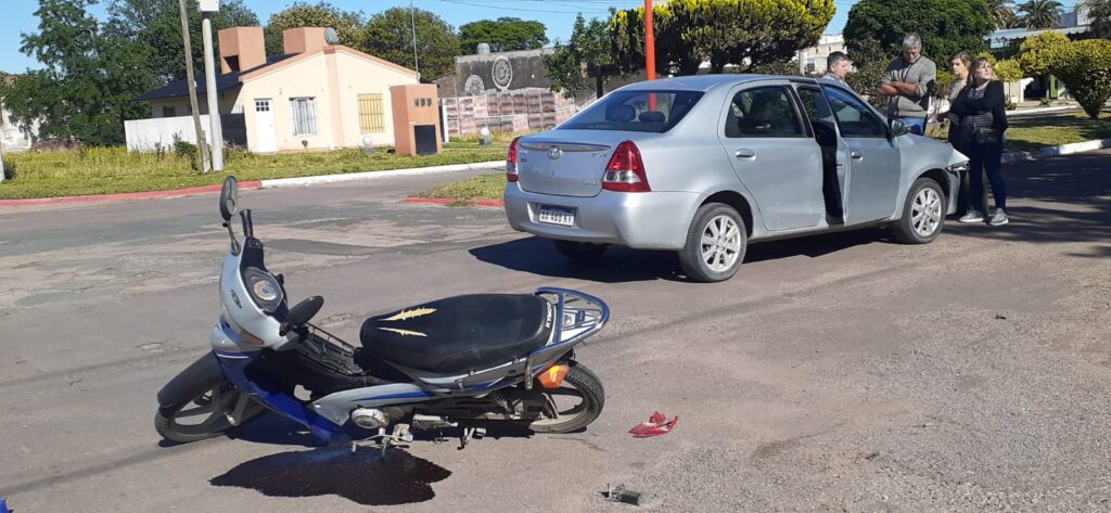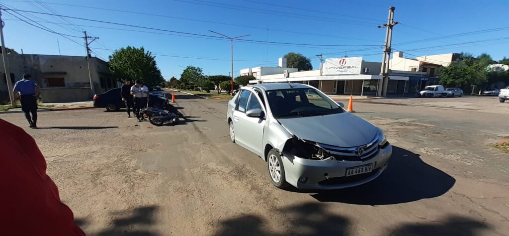 Una fuerte colisión se produjo esta mañana en nuestra ciudad entre una moto y un automóvil en la intersección del Boulevard Hipóilito Yrigoyen y España