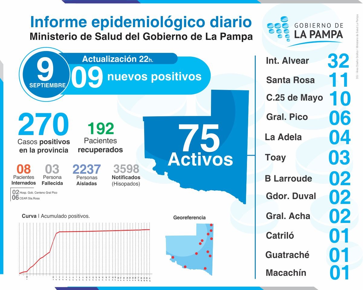 El Gobierno de la Provincia de La Pampa a través del Ministerio de Salud, comunicó que horas de la noche del día de hoy, miércoles 9 de septiembre, se finalizó con el procesamiento de 31 muestras, de las cuales 9 resultaron positivas para COVID-19, todas ellas pertenecientes a la localidad de Intendente Alvear.