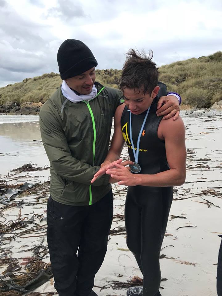 Entre risas, el joven deportista contó que al finalizar la carrera ‘sentí mucho frío’. “Sentí mucho frío, mas que nada en las manos porque el traje de neoprene va descubierto. Así que me saqué el traje, me quede en malla y me puse a trotar un poco, pero me sentí muy bien”, recordó.
