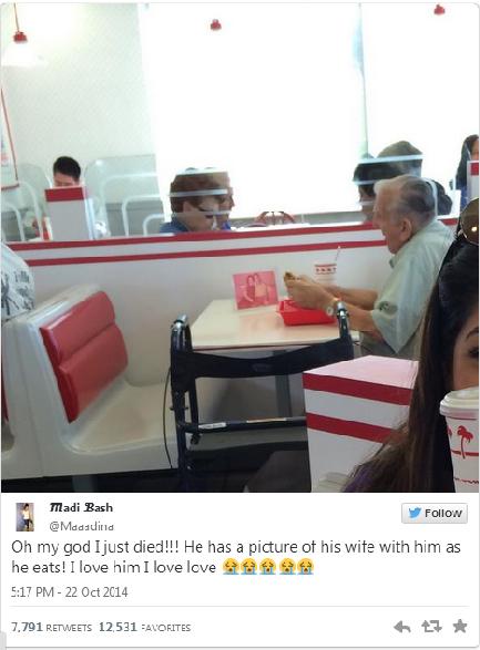 Una usuaria de Twitter subió una imagen en la que se ve a un anciano comiendo en un restaurante con un retrato de su mujer muerta. E inmediatamente se viralizó.