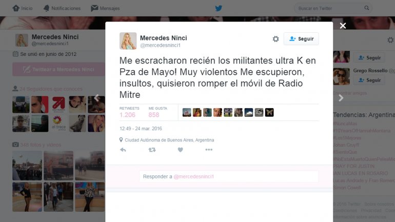La periodista Mercedes Ninci pasó un mal momento esta tarde al ser agredida y escupida por manifestantes kirchneristas mientras cubría una de las marchas en Plaza de Mayo por el 40 aniversario del último golpe militar.