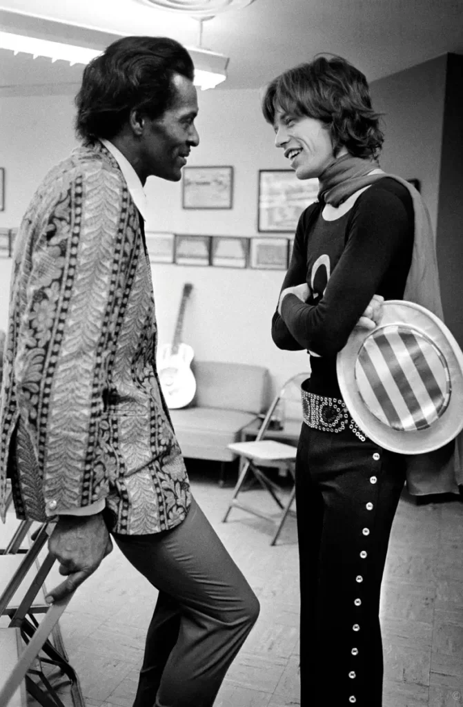 Chuck Berry y Mick Jagger conversan en un camarín, en 1969