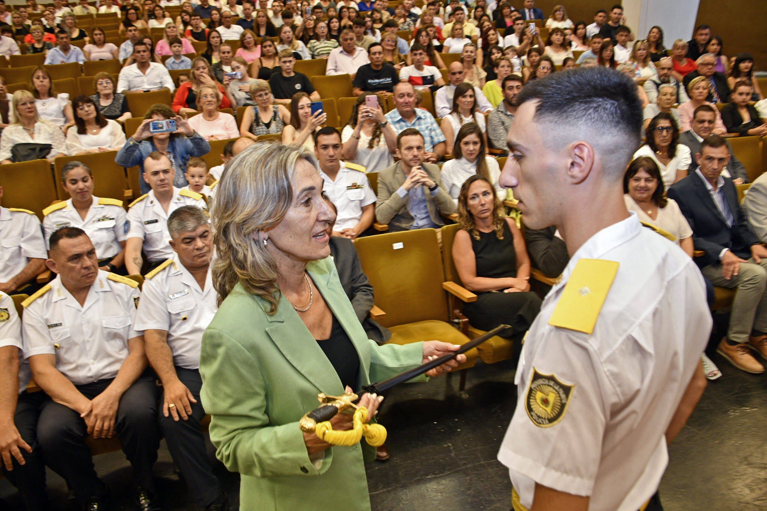 La ceremonia incluyó la entrega de sables, despachos y otros atributos a los oficiales de policía egresados, quienes, además, prestaron juramento de fidelidad a la Constitución Provincial.