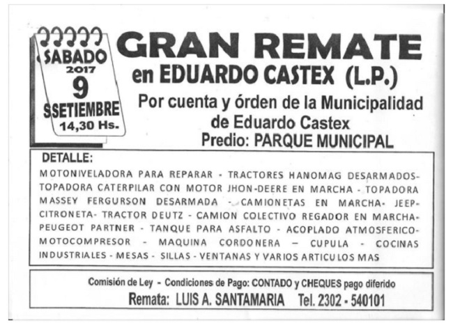 En el año 2012 el municipio había realizado un remate de estas características lo que permitió luego adquirir maquinarias nuevas y renovar el Parque Automotor, en esta oportunidad el objetivo es el mismo.
