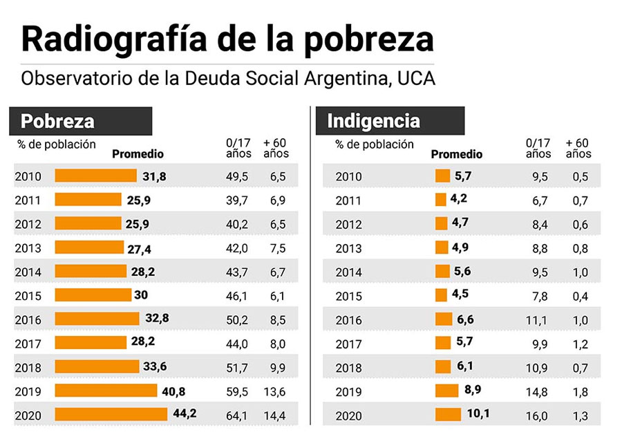 Dos días después de que un informe de la OCDE presentara la actualización del pronóstico de recesión en la Argentina, con la mayor baja entre los miembros del G-20, el Observatorio de la Deuda Social Argentina de la Universidad Católica Argentina dio a conocer el “Informe de Avance: Deudas Sociales en la Argentina 2010-2020. Crisis del empleo, pobrezas y desigualdades estructurales en el contexto COVID-19”, el cual refleja los aumentos en las tasas de pobreza, indigencia y de desempleo en el cuatrimestre julio a octubre de este año.
