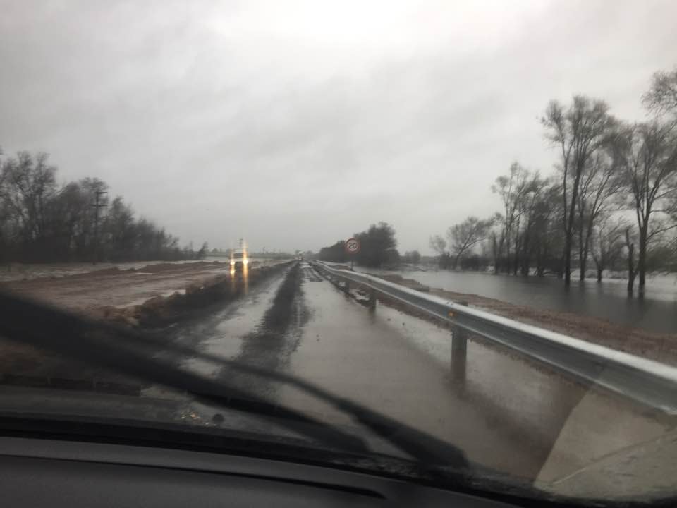 La lluvia caída en la jornada de hoy complicó la circulación en el aleto de la ruta nacional 35, entre las localidades de Eduardo Castex y Winifreda