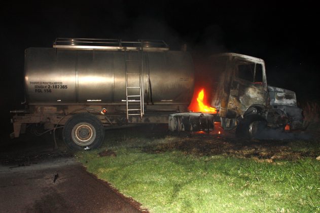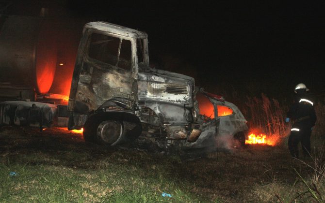 Por causas que se tratan de establecer chocaron de frente un camión Mercedes Benz, transportador de leche, y un automóvil, Volkswagen Sirocco. Ambos rodados terminaron en la banquina e incendiados.