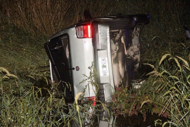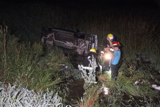 En ese lugar y por causas que se investigan, un Fiat Uno identificado con la patente IUW-243, terminó volcado sobre uno de sus laterales y semi sumergido en un charco a la vera de la ruta.