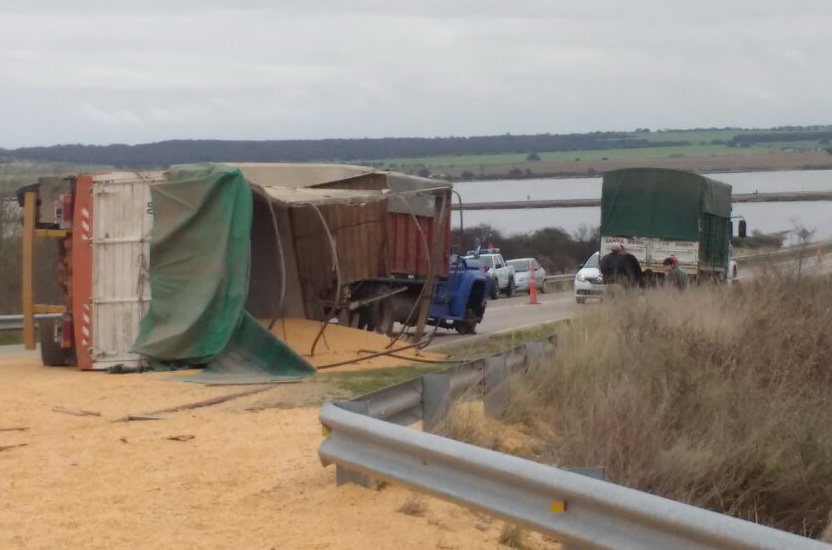 Volcó acoplado cargado de maíz en la ruta 35