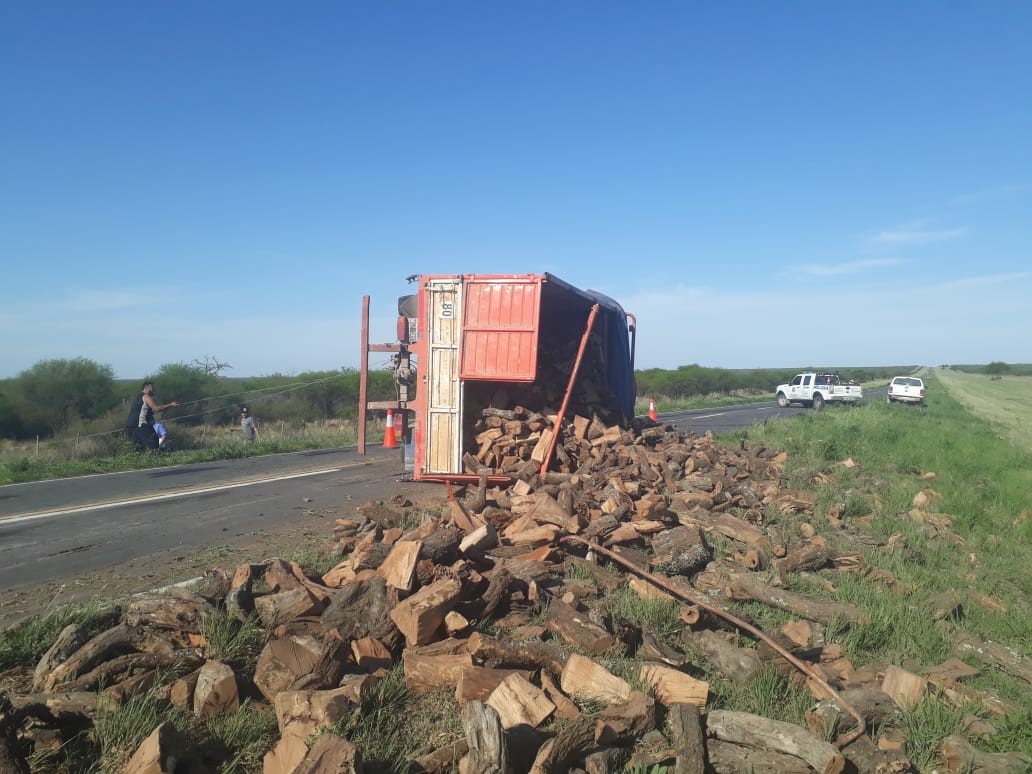 El accidente se produjo ayer a las 16.30 horas en la ruta provincial 102 entre los kilómetros 98 y 99, un camión Mercedes Benz que transportaba postes quedó volcado sobre el lateral derecho sobre la cinta asfáltica.